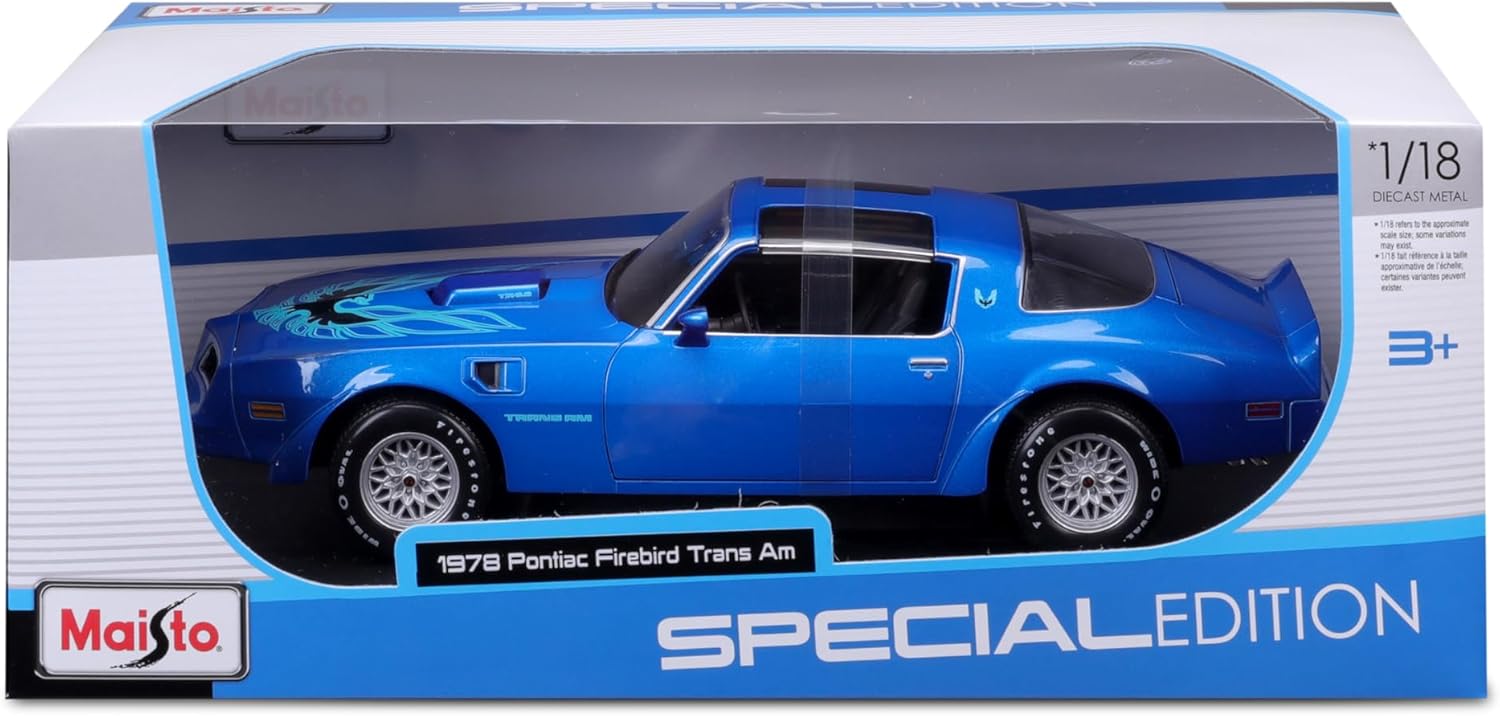 Maisto 1/18 scale 1978 Firebird Trans Am Black Metallic with Hood Graphics Special Edition Series 1/18 Diecast Model Car 31464 blue