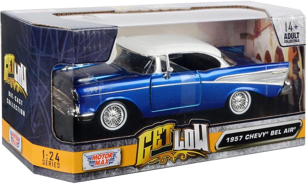 1957 Chevrolet Bel Air Lowrider Blue with White roof 1/24 Diecast Model Motormax Get Low 79030
