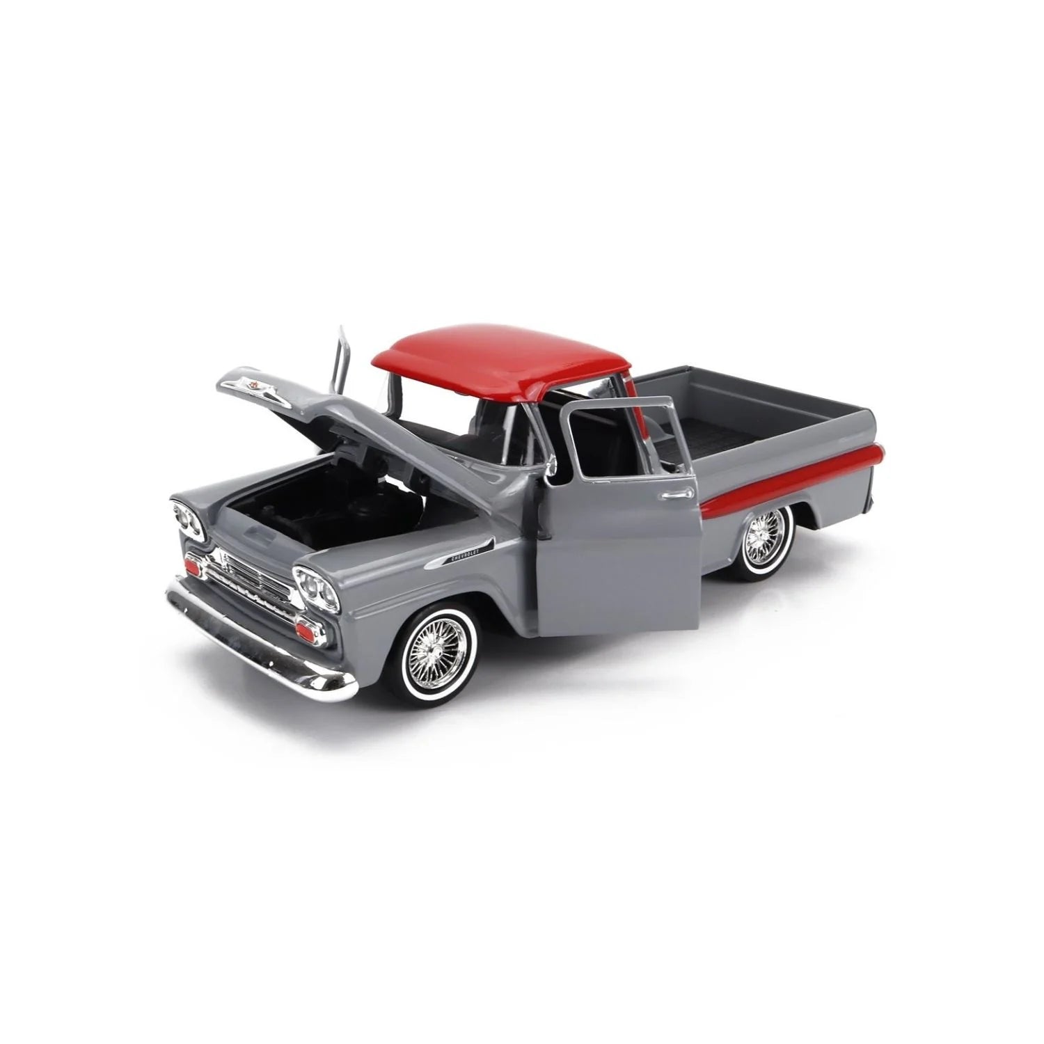 1958 Chevy Apache Fleetside Pickup Truck Lowrider Gray with Red Top Motormax Get Low Series 1/24 Diecast Model Car 79033