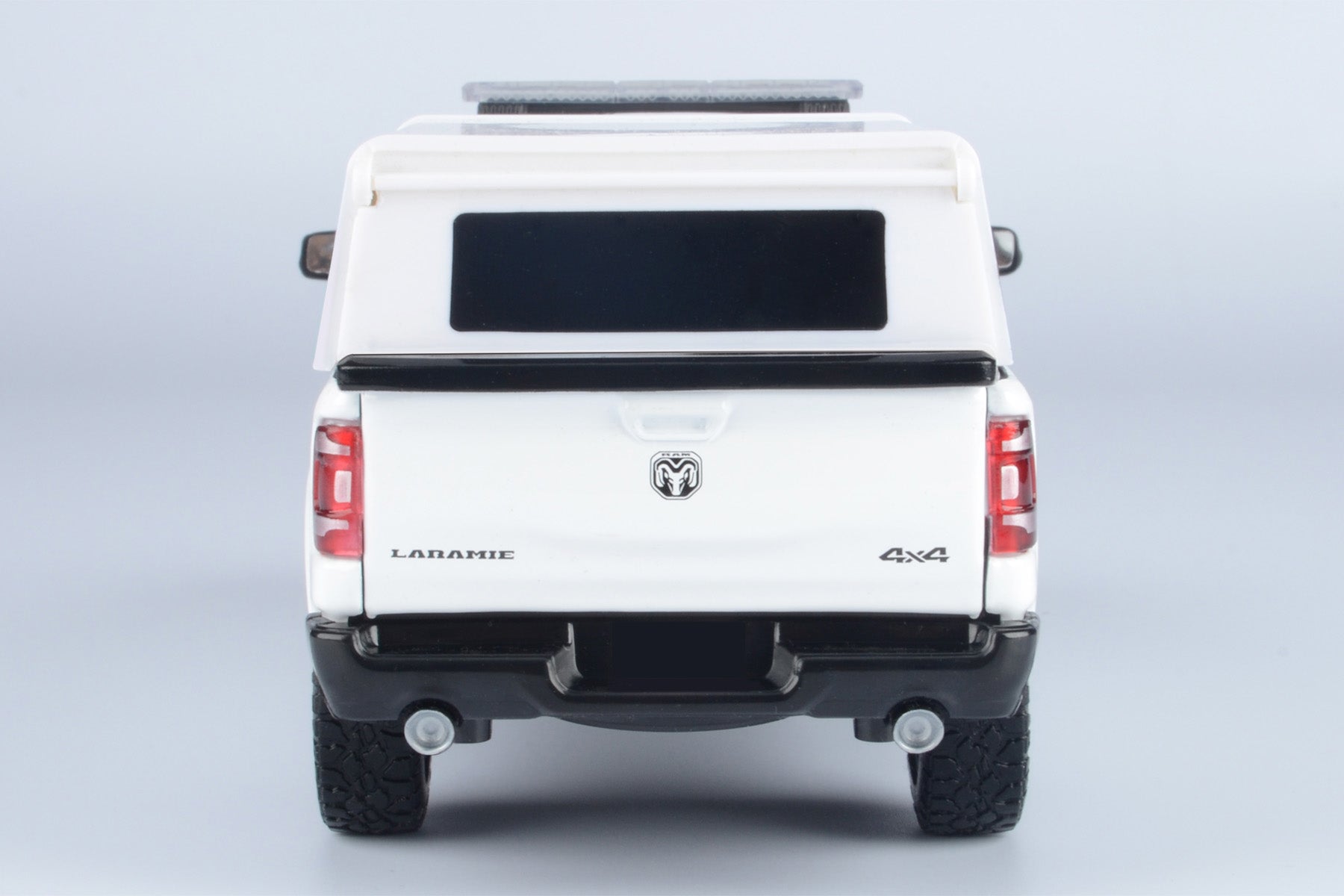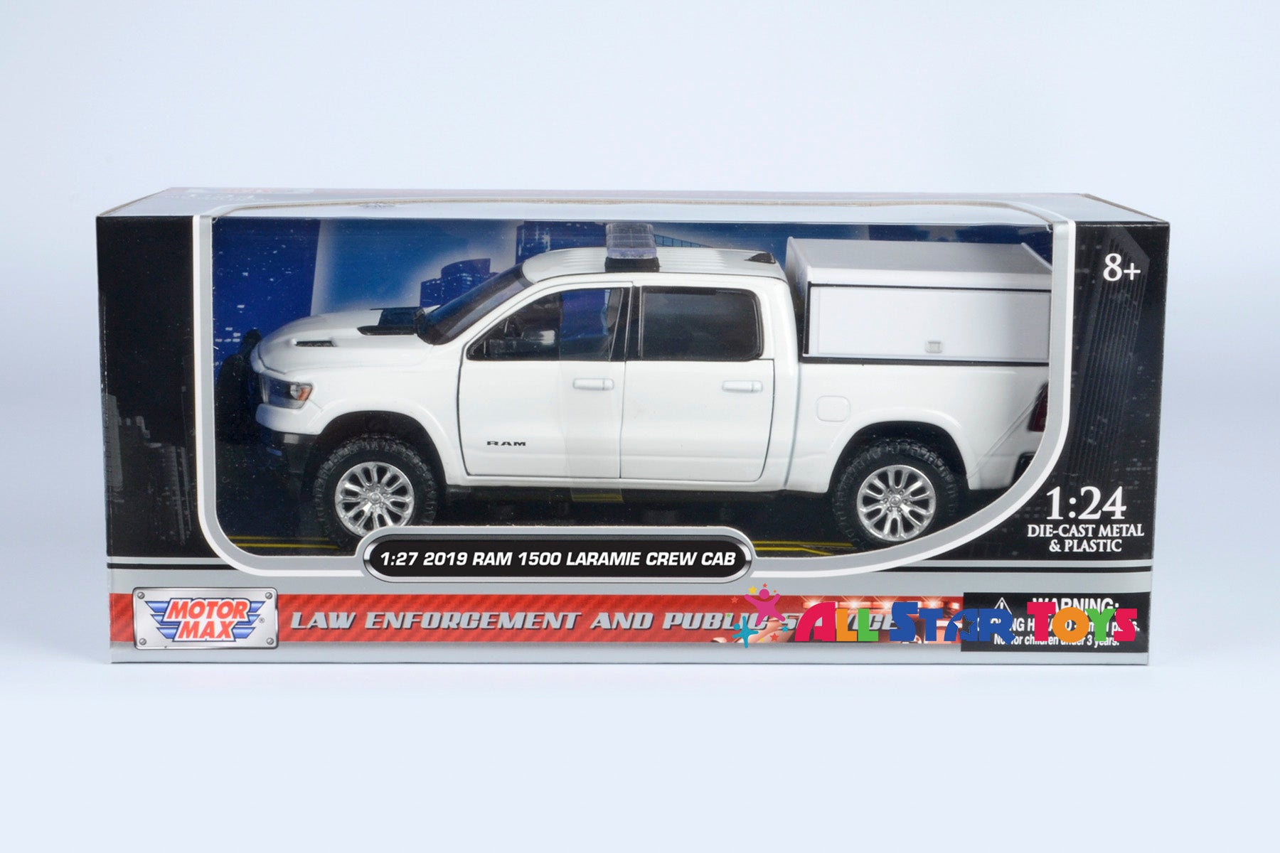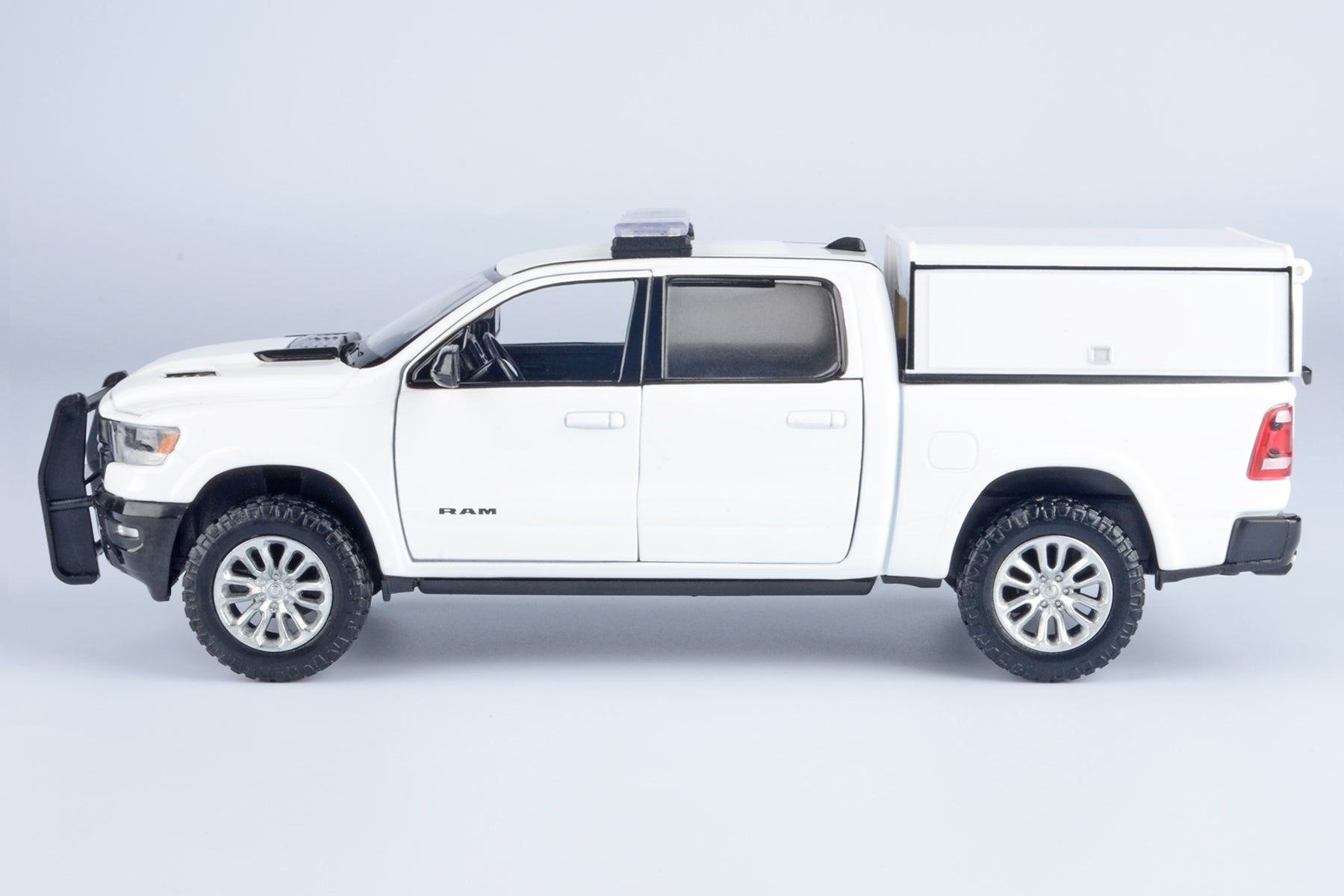 2019 Ram 1500 Laramie Crew Cab with Camper Cap Police Pickup Truck 1:27 Diecast Model Motormax Law Enforcement Series 76817 WHITE